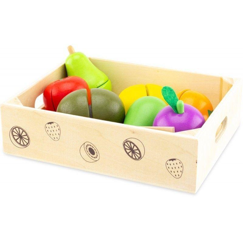 Une cagette comprenant 9 éléments en bois, 1 couteau et 1 plateau de découpe, 1 poire, 1 citron, 1 orange, 1 kiwi, 1 prune, 1 pomme et 1 avocat.
